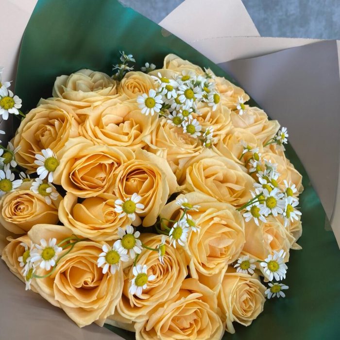 Роза – 25 шт.Матрикария – 2 шт.Упаковка – 3 шт.Атласная лента – 1 шт.