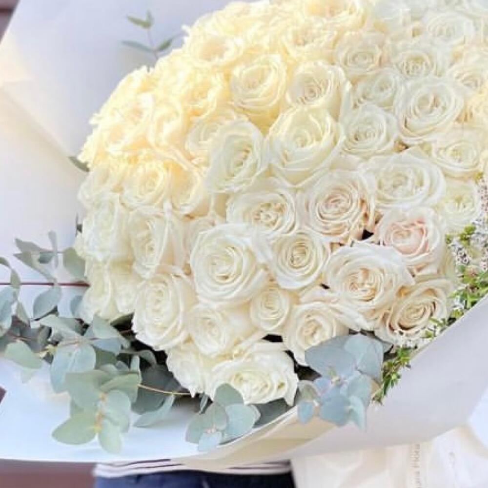 Роза белая – 51 шт.Упаковка дизайнерская – 1 шт.Лента атласная – 1 шт.Открытка – 1 шт.инструкция по уходу за цветами – 1 шт.коробка переноска – 1 шт.хорошее настроение – 100 шт.Кризал – 1 шт.Эвкалипт – 10 шт.