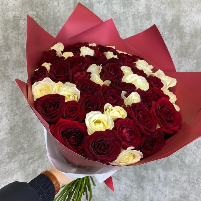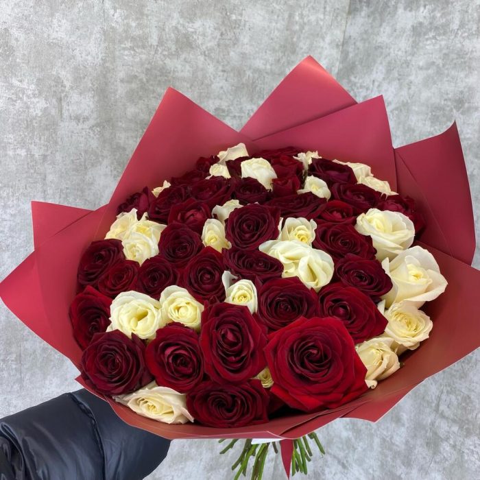 Роза красная – 38 шт.Роза белая – 21 шт.Упаковка – 3 шт.Атласная лента – 1 шт.