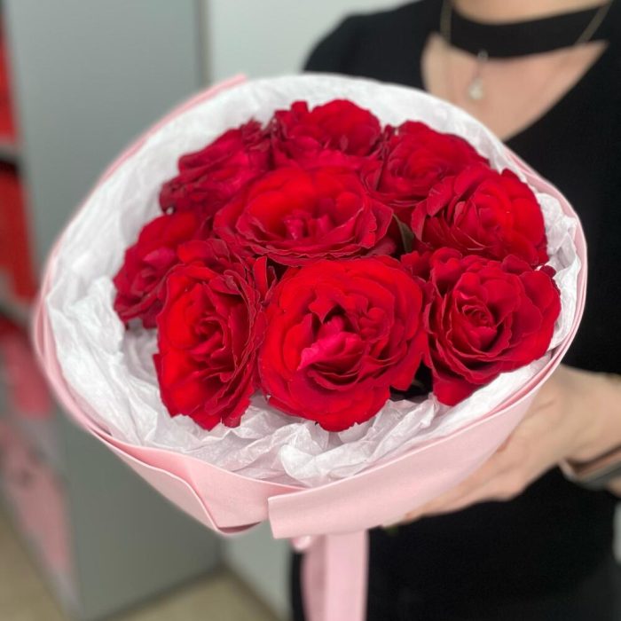 Роза красная – 9 шт.Упаковка – 1 шт.Лента атласная – 1 шт.