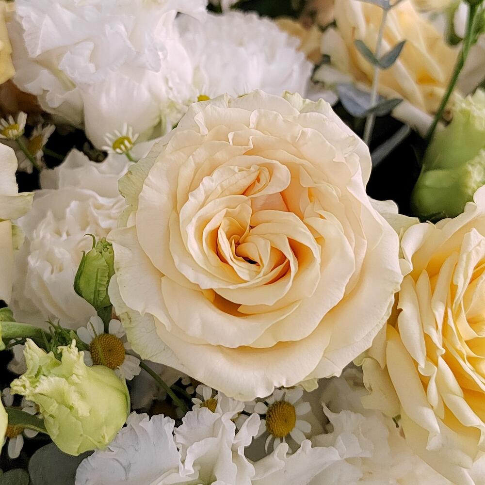 Роза кустовая – 4 шт.Гвоздика – 7 шт.Матрикария – 4 шт.Эустома – 4 шт.Эвкалипт – 3 шт.