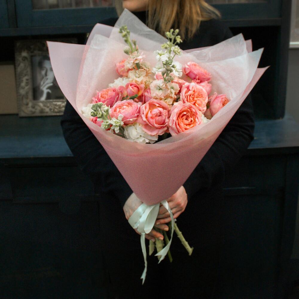 Букет из кустовой пионовидной розы Джульетта, маттиолы и диантуса