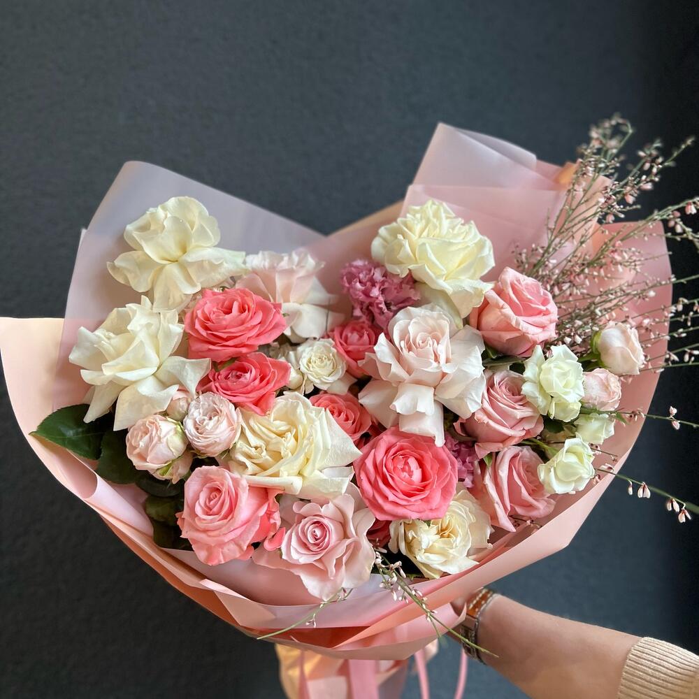 Букет из нежных роз и генисты