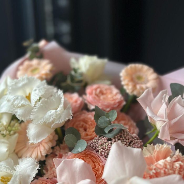 Кустовая пионовидная роза – 2 шт.Одноголовая роза – 6 шт.Гербера – 3 шт.Тюльпан – 3 шт.Озотамнус – 1 шт.Сирень – 1 шт.Эвкалипт – 3 шт.декоративная упаковка – 1 шт.Атласная лента – 1 шт.