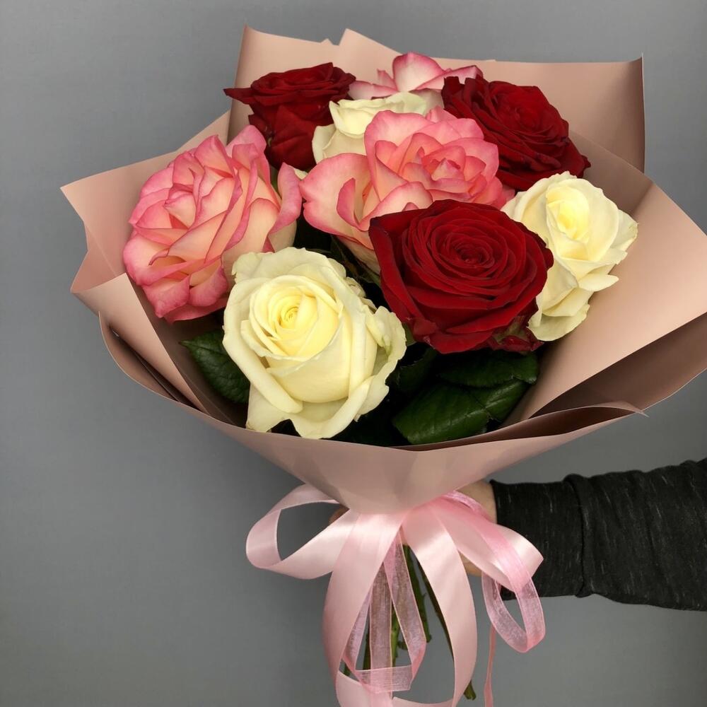 Лента атласная – 1 шт.Пленка матовая – 1 шт.розы сорта red naomi – 3 шт.роза сорта аваланж – 3 шт.роза сорта джумилия – 3 шт.