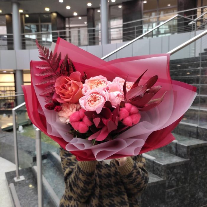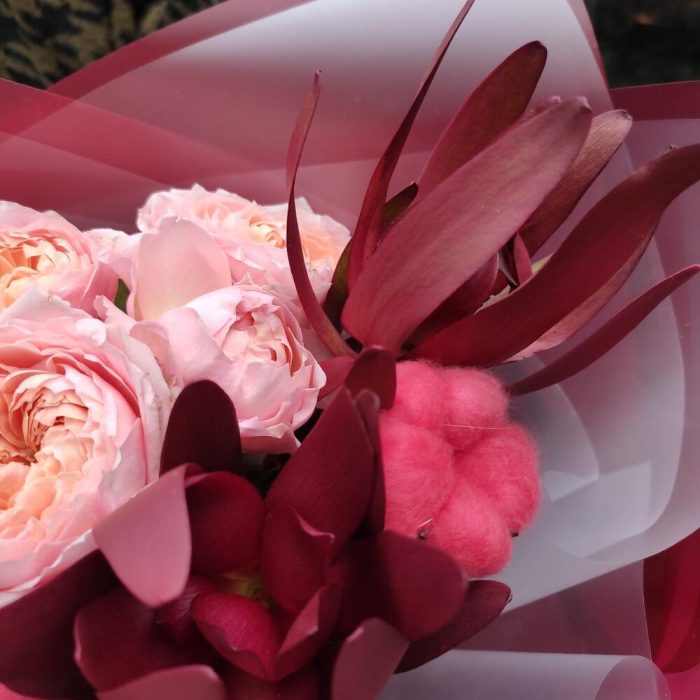 Роза кустовая пионовидная – 1 шт.Роза – 1 шт.леукондендрон – 2 шт.Хлопок – 2 шт.Гвоздика – 1 шт.Фаларис – 3 шт.Папоротник – 1 шт.Лента – 2 шт.Упаковка дизайнерская – 2 шт.