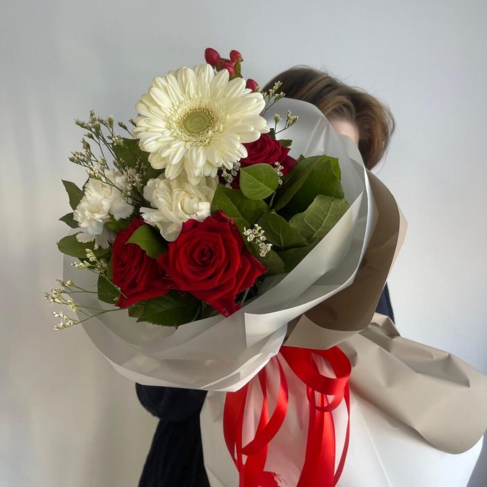 Букет из роз и гербер в дизайнерском оформлении