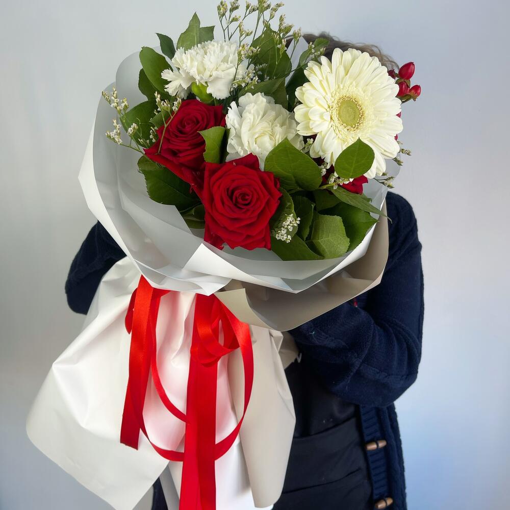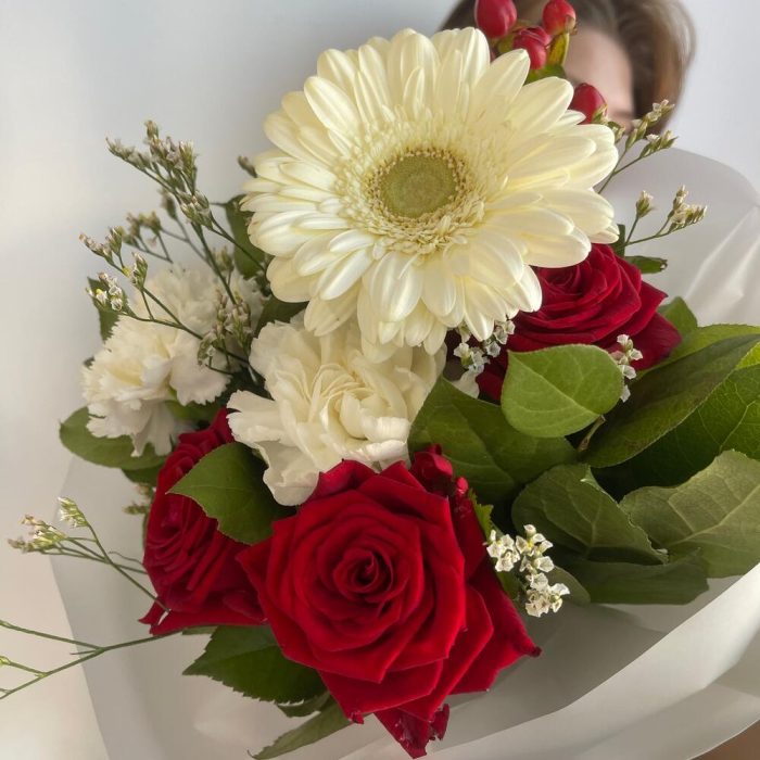 Гиперикум – 1 шт.Лимониум – 1 шт.Роза красная – 3 шт.Гвоздика – 2 шт.Гербера – 1 шт.Салал листья – 2 шт.Пленка матовая – 6 шт.