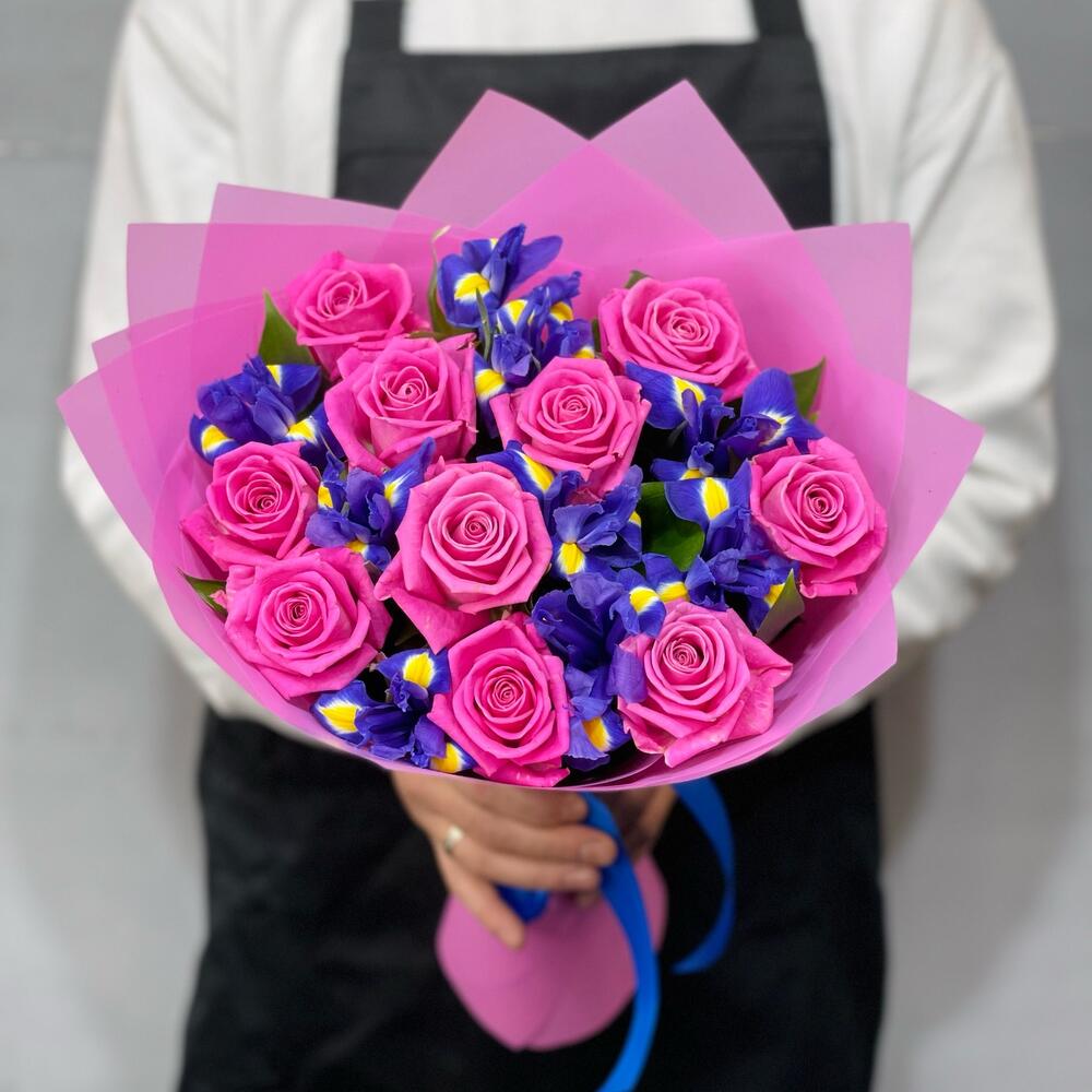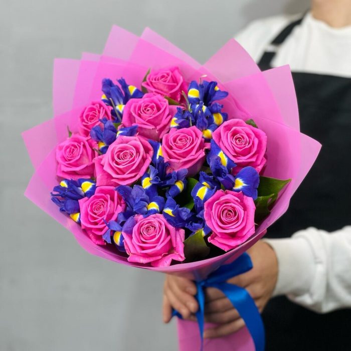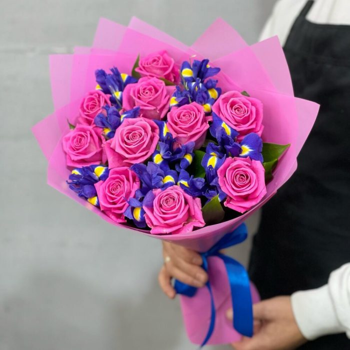 аква роза – 10 шт.Ирис – 9 шт.Рускус – 10 шт.Упаковка дизайнерская – 3 шт.Лента атласная – 1 шт.