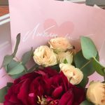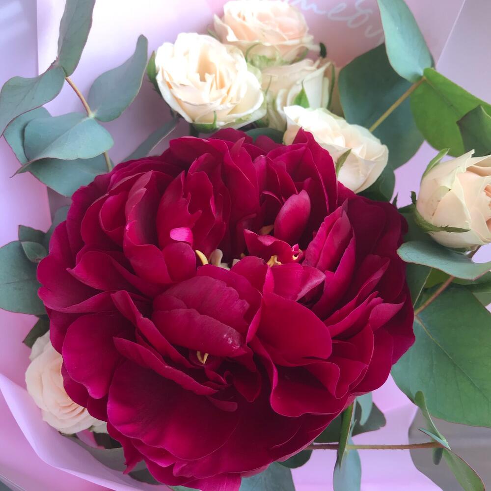 Пион – 1 шт.Роза кустовая – 2 шт.Эвкалипт – 2 шт.Упаковка дизайнерская – 3 шт.