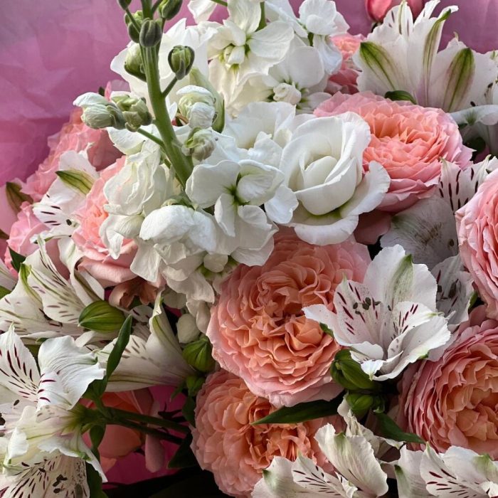Альстромерия – 4 шт.Маттиола – 3 шт.Роза Джульетта – 3 шт.Упаковка дизайнерская – 4 шт.Лента атласная – 1 шт.