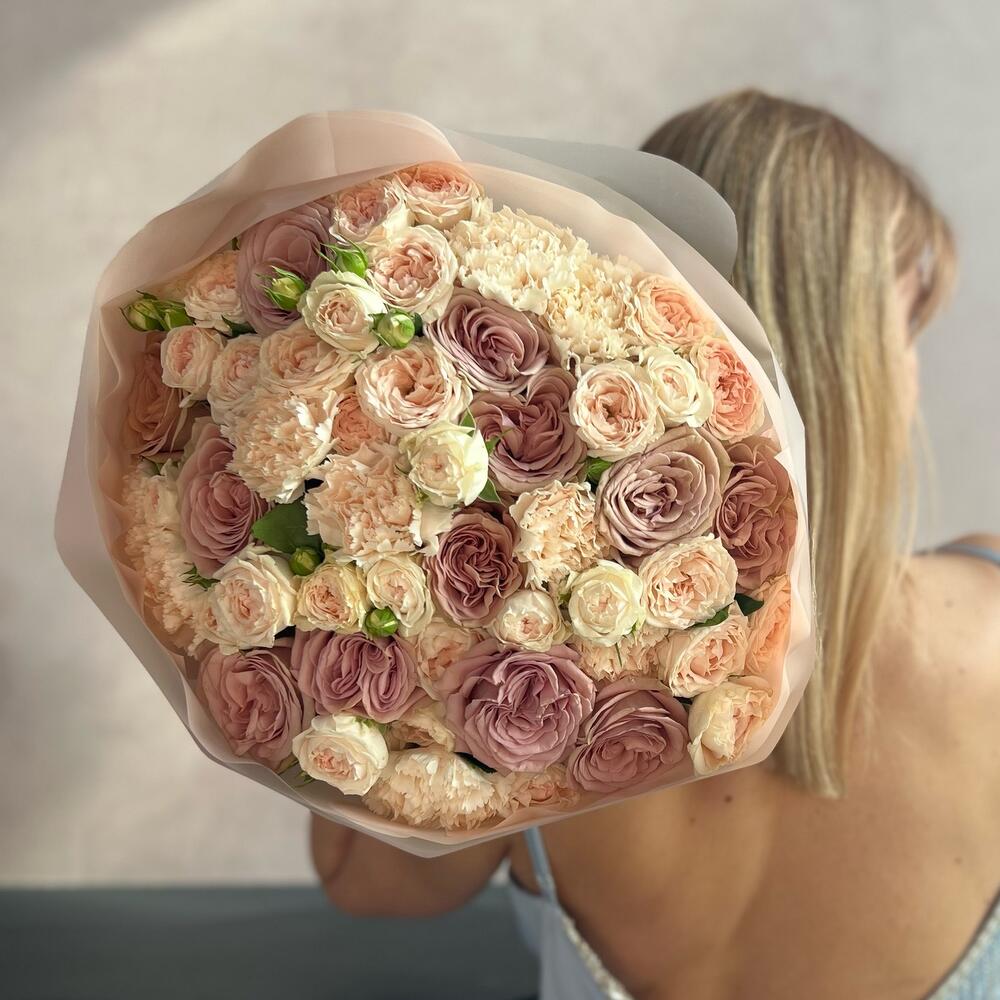 Пионовидная роза – 12 шт.Кустовая роза – 7 шт.Диантус – 9 шт.декоративная упаковка – 1 шт.Атласная лента – 1 шт.