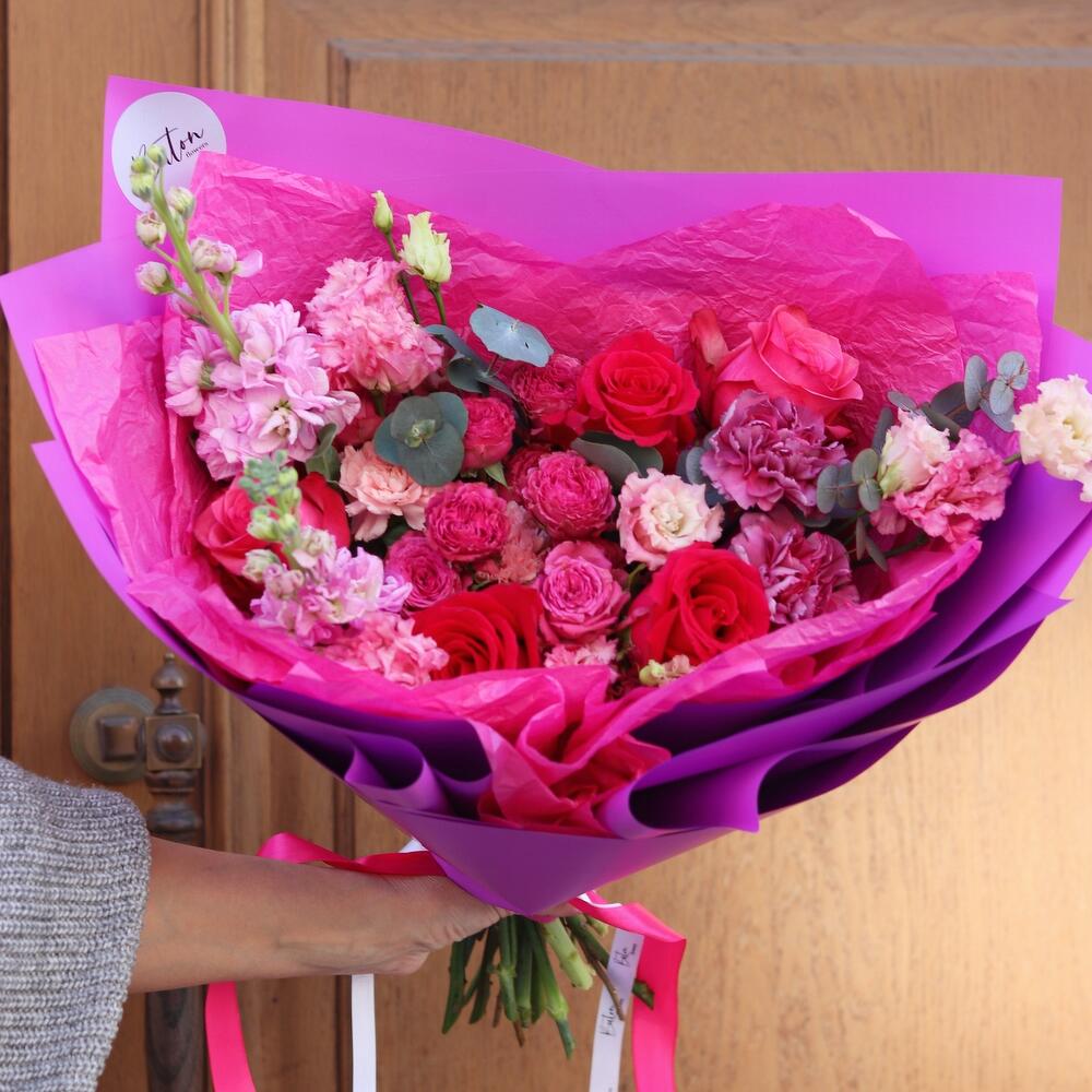 Букет премиум “Малиновый рай” с пионовидными розами, лизиантусом и маттиолой