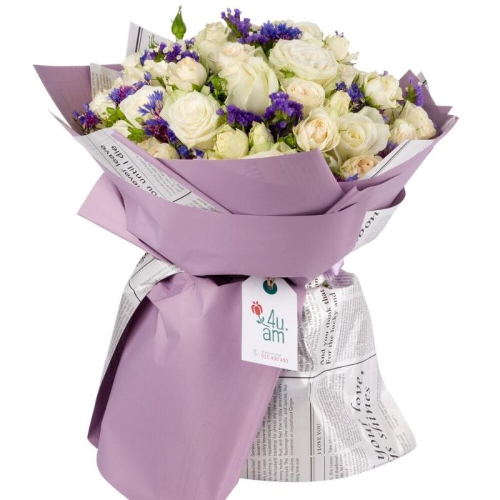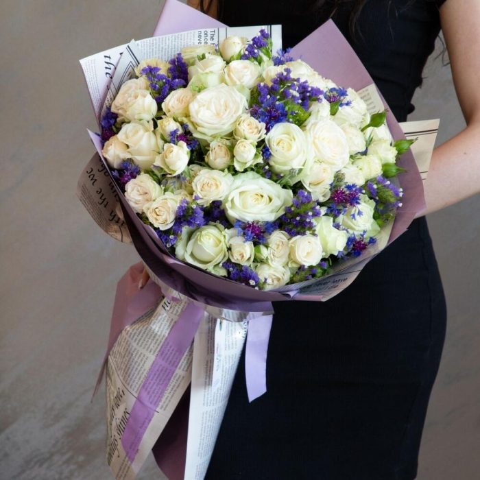 Роза – 15 шт. Кустовая роза – 9 шт. Лимониум сиреневый – 1 шт.