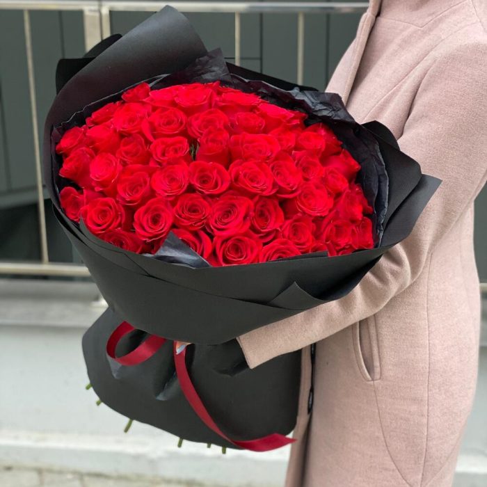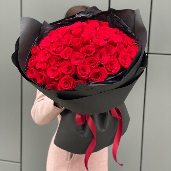 Букет из 51 красной розы в черном стильном оформлении!