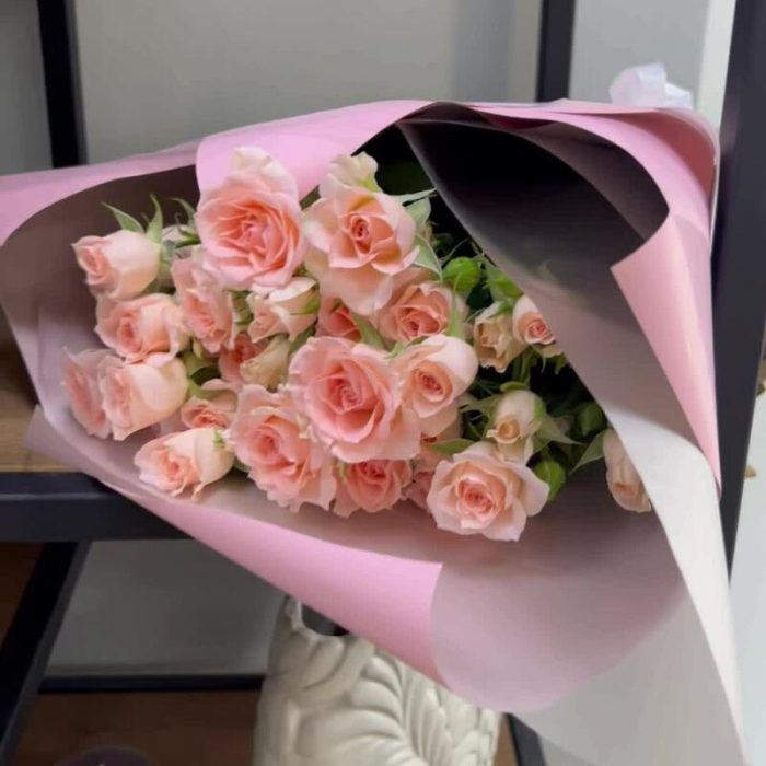 Кустовая роза – 5 шт.Лента атласная – 1 шт.Упаковка дизайнерская – 3 шт.