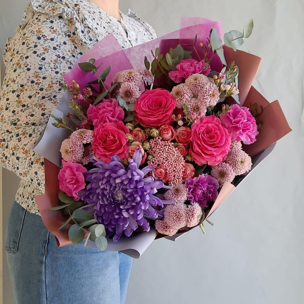 Роза – 3 шт.Хризантема – 1 шт.Сантини – 5 шт.Роза кустовая – 1 шт.Озотамнус – 1 шт.Ваксфлауэр – 2 шт.Диантус – 5 шт.Эвкалипт – 3 шт.Фисташка – 5 шт.Упаковка дизайнерская – 2 шт.Лента атласная – 1 шт.