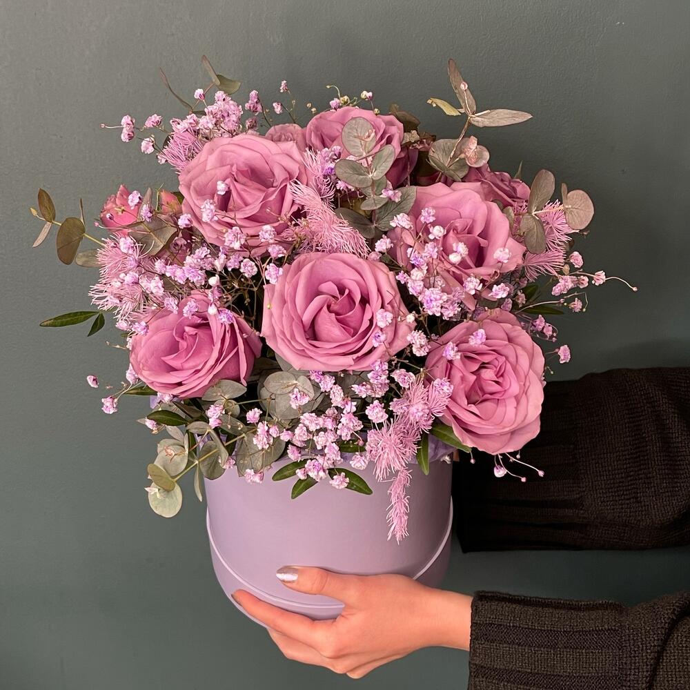 Цветочная композиция в шляпной коробке с розами и гипсофилой. Дарите радость и искренние эмоции просто так.* По вашей просьбе, мы подпишем открытку с наилучшими пожеланиями.* Каждый букет цветов (композиция цветов в коробке) упаковывается в прозрачную плёнку и в крафтовый пакет.* Для нежных сортов цветов предусмотрена временная ваза с водой-аквабокс.* К букету прилагается инструкция по уходу и пакетик с подкормкой для продления жизни срезанных цветов в вазе и цветочных композициях на флористической губке.