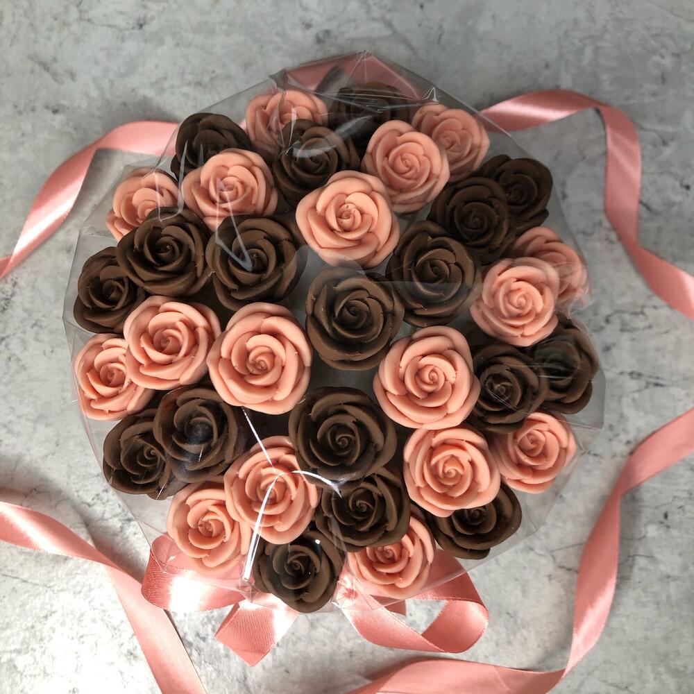 молочный бельгийский шоколад callebaut – 18 шт.белые шоколадные розы – 17 шт.Мини открытка – 1 шт.