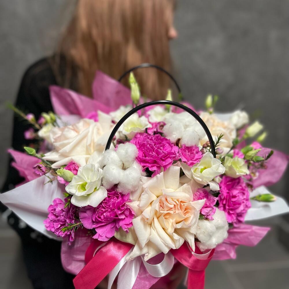 Ваксфлауэр – 4 шт.Лента – 3 шт.Лизиантус – 3 шт.Хлопок – 3 шт.Упаковка – 3 шт.Сумка – 1 шт.Диантус кустовой – 5 шт.Оазис флористический – 1 шт.Диантус сортовой – 5 шт.роза охара пионовидная – 3 шт.