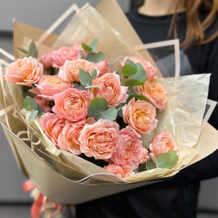 роза пионовидная кустовая джульетта черри – 5 шт.Эвкалипт – 3 шт.Тишью – 2 шт.пленка дизайнерская с каймой – 2 шт.Пленка матовая – 4 шт.Лента атласная – 2 шт.