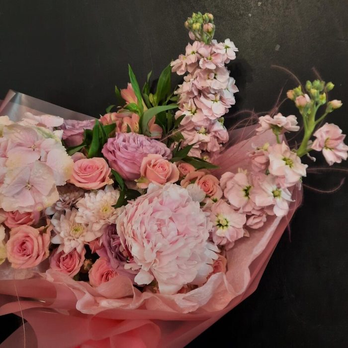 Гортензия – 1 шт.Пион Сара Бернар – 1 шт.Роза пионовидная – 3 шт.Роза кустовая – 3 шт.Альстромерия – 3 шт.Маттиола – 2 шт.Фисташка – 3 шт.Упаковка дизайнерская – 1 шт.