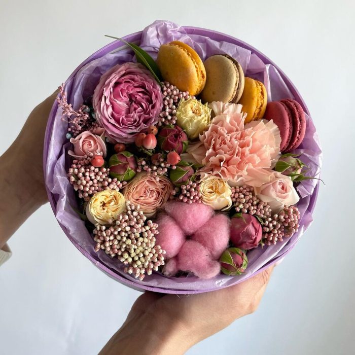 Гиперикум – 1 шт.Хлопок – 1 шт.Кустовая роза – 3 шт.Гвоздика – 1 шт.Коробка шляпная – 1 шт.Оазис флористический – 1 шт.макарон (пирожное) – 4 шт.райз – 1 шт.