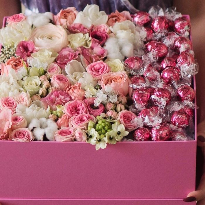 Шляпная коробка – 1 шт.Роза кустовая – 2 шт.Хлопок – 2 шт.Эустома – 2 шт.Орнитогалум – 2 шт.Конфеты – 300 гр.