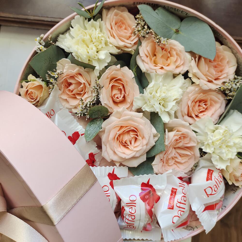 Коробка – 1 шт.Конфеты – 7 шт.роза куст – 2 шт.Эвкалипт – 1 шт.лимонум – 1 шт.Диантус – 3 шт.