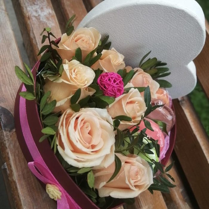Коробка сердце с цветами и пирожными
