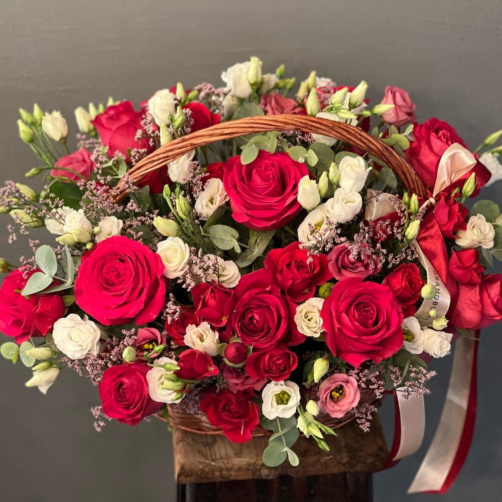 Роза одноголовая – 11 шт.эустома микс – 11 шт.зелень декоративная – 17 шт.корщинка плетеная – 1 шт.Оазис флористический – 2 шт.работа флориста – 1 шт.Лента атласная – 2 шт.пленка транспортировочная – 1 шт.