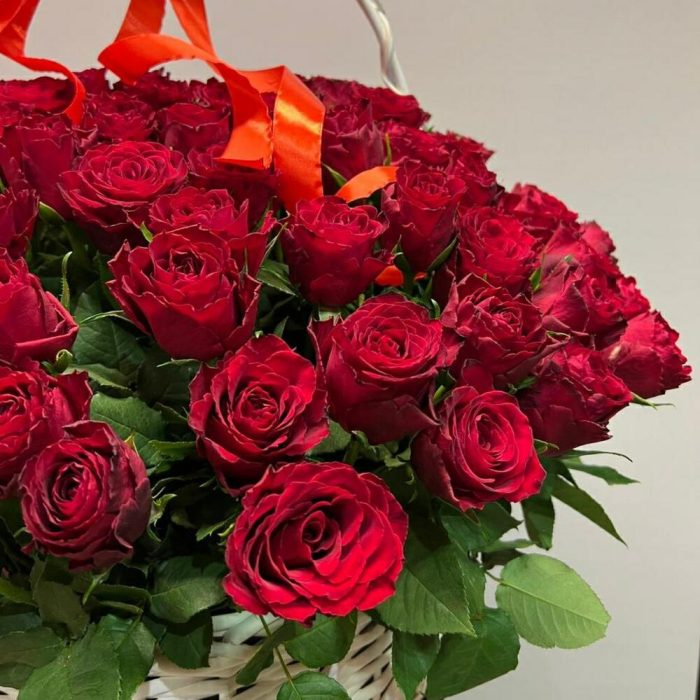 Роза красная – 101 шт.Корзина плетеная – 1 шт.Оазис флористический – 4 шт.Лента атласная – 1 шт.