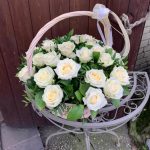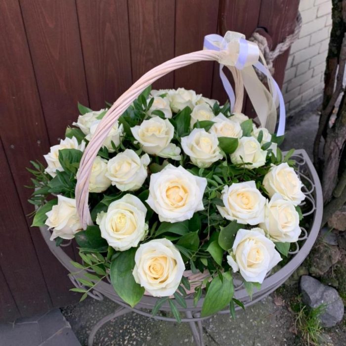Корзина – 1 шт.Рускус – 10 шт.Роза белая – 25 шт.Оазис флористический – 1 шт.
