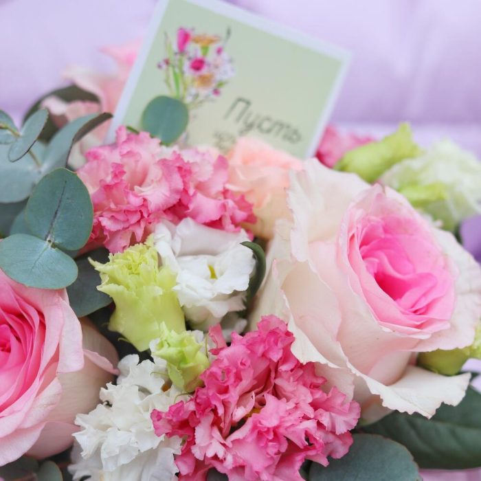 кашпо вязанное ручной работы – 1 шт.эустома кружевная – 1 шт.Роза пионовидная – 3 шт.Эвкалипт – 3 шт.Открыточка с вашими пожеланиями – 1 шт.