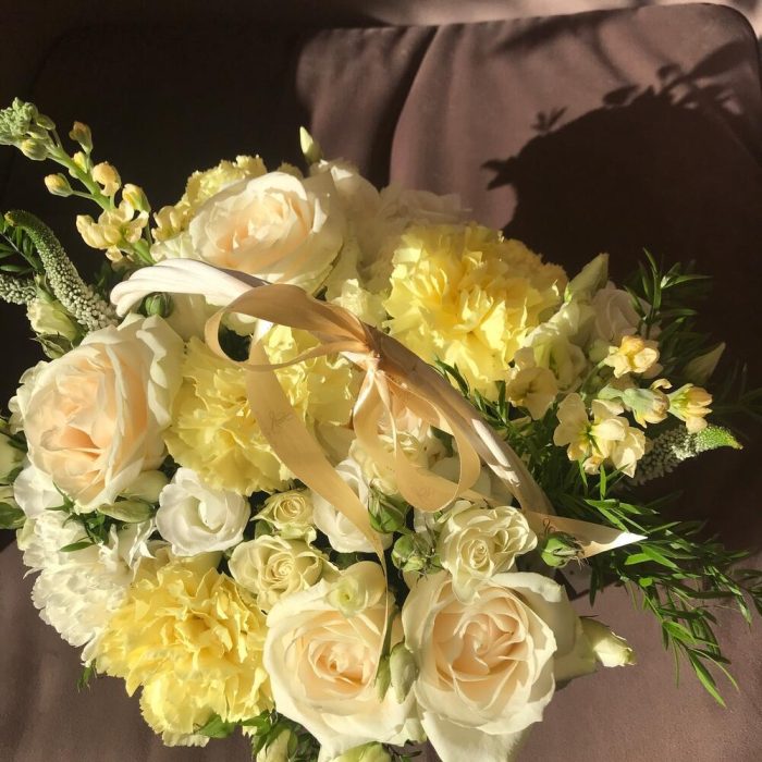 корзина 20 см – 1 шт.Губка флористическая – 1 шт.Роза кустовая – 3 шт.Лизиантус – 5 шт.Вероника – 3 шт.Маттиола – 2 шт.Аспарагус – 1 шт.Роза белая – 5 шт.Гвоздика – 7 шт.