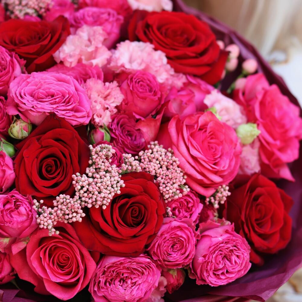 Роза красная – 4 шт.Гвоздика – 4 шт.Гиперикум – 3 шт.Ваксфлауэр – 1 шт.Роза малиновая – 3 шт.Роза кустовая – 3 шт.Лизиантус – 2 шт.Открыточка с вашими пожеланиями – 1 шт.Шоколадка – 1 шт.инструкция по уходу за цветами – 1 шт.подкормка для срезанных цветов – 1 шт.