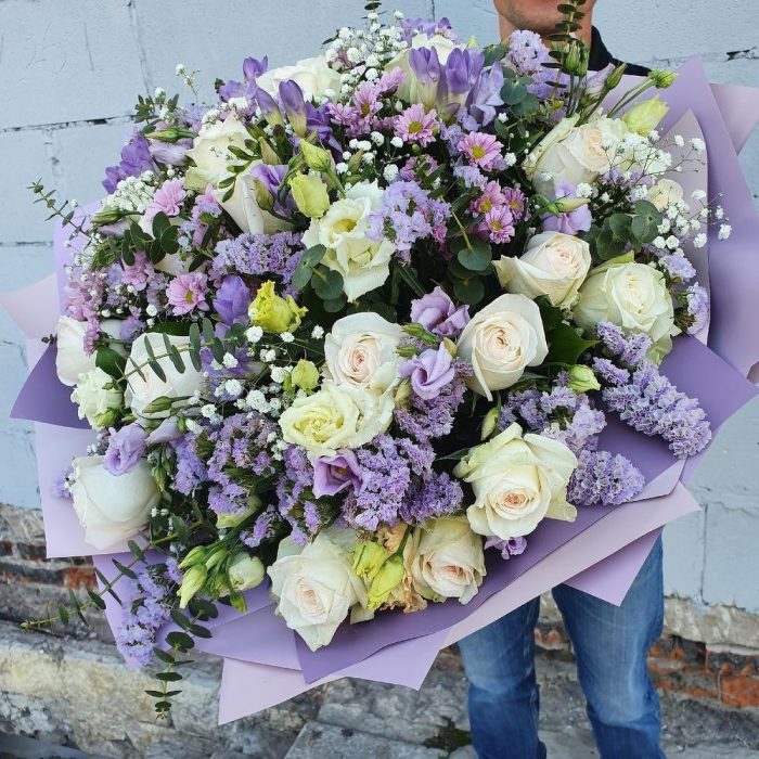 Гипсофила – 5 шт.Эвкалипт – 5 шт.Зелень – 25 шт.Упаковка дизайнерская – 5 шт.Роза Охара – 25 шт.Сантини розовая – 6 шт.Статица лиловая – 5 шт.Фрезия лиловая – 6 шт.