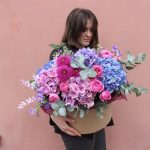Георгина – 3 шт.Гортензия – 5 шт.Маттиола – 10 шт.Роза пионовидная кустовая – 5 шт.рускус стабилизированный – 2 шт.Эвкалипт – 10 шт.Тишью – 2 шт.Шляпная коробка – 1 шт.Оазис флористический – 2 шт.