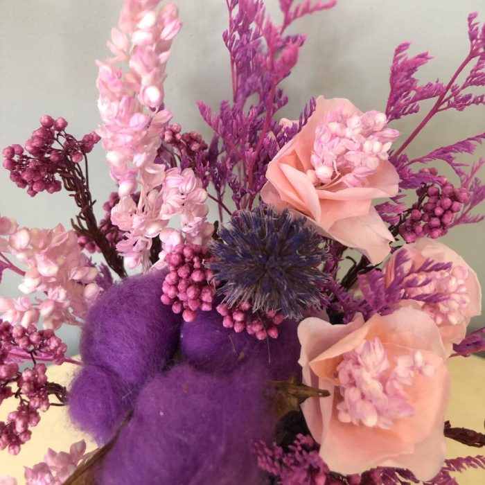 Керамическое кашпо – 1 шт.Хлопок – 1 шт.Роза стабилизированная – 3 шт.сорго – 1 шт.Лимониум – 1 шт.Озотамнус – 1 шт.Эхинопс – 1 шт.