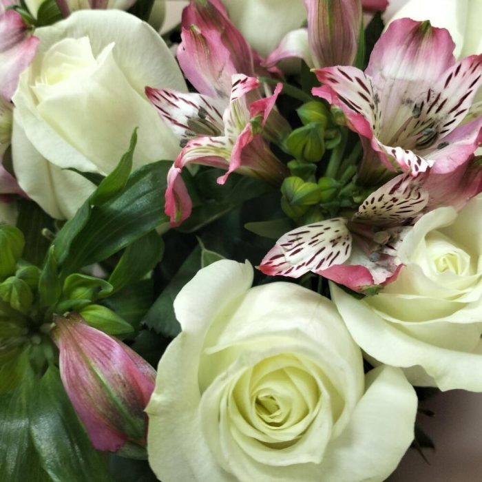 Упаковка – 2 млЛента атласная – 1 шт.Альстромерия Микс Европа – 3 шт.роза 65 см – 7 шт.
