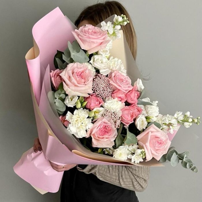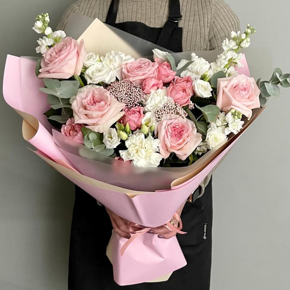 Роза Эквадор – 5 шт.Маттиола – 3 шт.Роза пионовидная кустовая – 2 шт.Лизиантус – 1 шт.Озотамнус – 2 шт.Диантус – 3 шт.Эвкалипт – 2 шт.Упаковка дизайнерская – 3 шт.