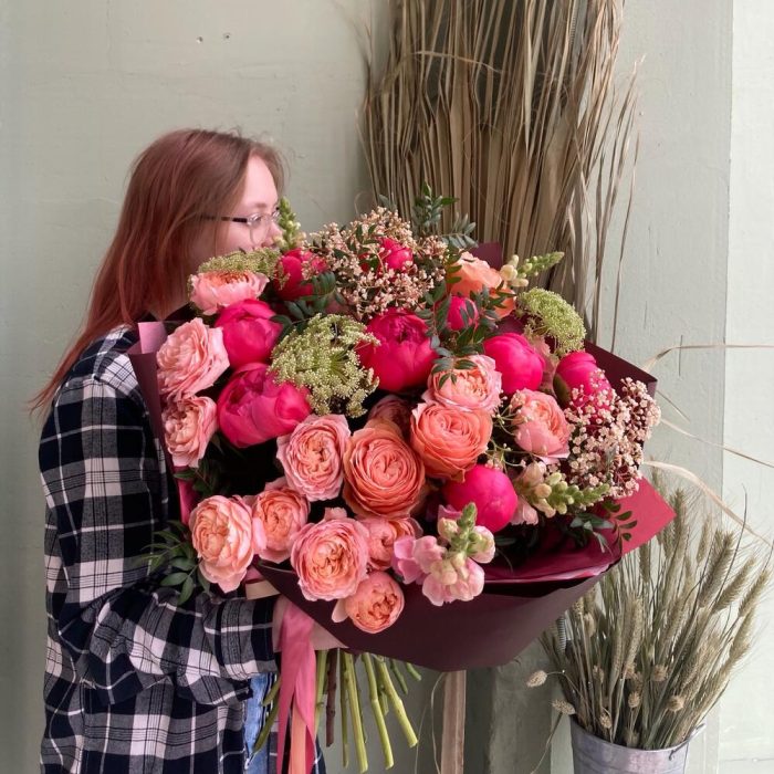 Пион – 9 шт.Роза пионовидная кустовая – 3 шт.Роза пионовидная – 3 шт.Львиный зев – 4 шт.зонтики – 3 шт.фатиния – 2 шт.Фисташка – 3 шт.Упаковка дизайнерская – 1 шт.Лента атласная – 1 шт.