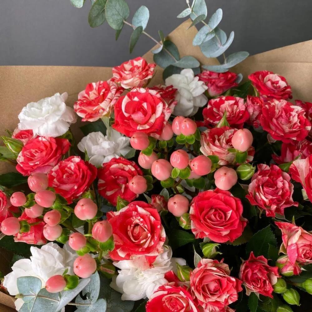Гиперикум – 2 шт.Роза кустовая – 5 шт.Эвкалипт – 1 шт.Джут – 1 шт.Крафт упаковка – 1 шт.Диантус кустовой – 3 шт.