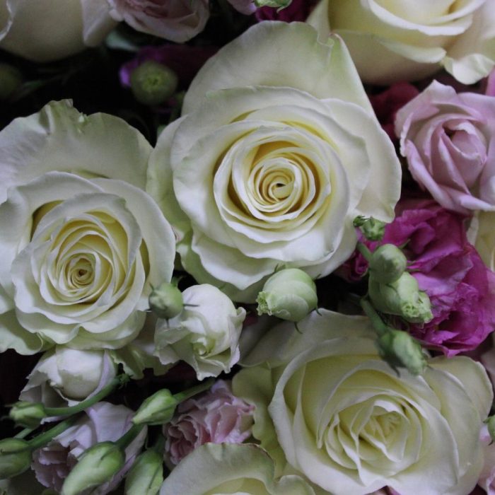 Роза премиум – 11 шт.Эустома – 7 шт.Пленка дизайнерская – 3 шт.Лента атласная – 2 шт.