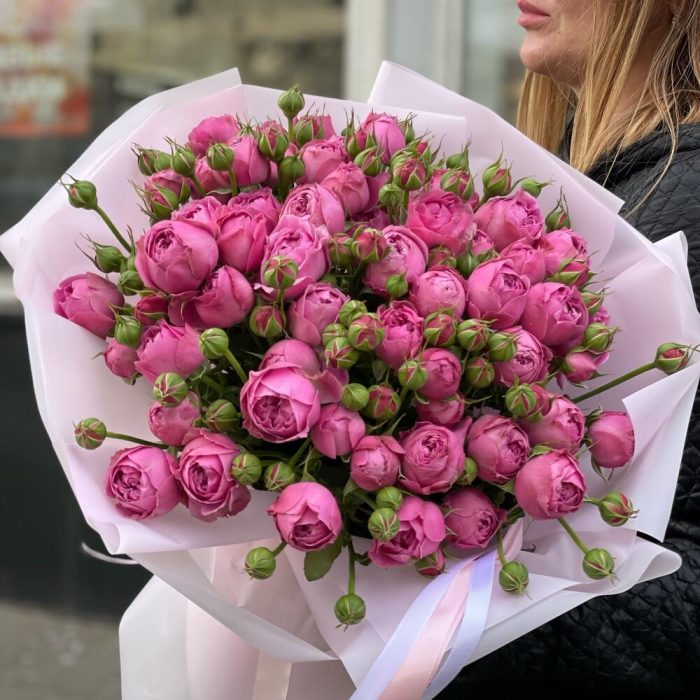 упаковка дизайнерская пленка – 5 шт.бант атласный двойной – 1 шт.пионовидная роза кустовая Misty Bubbles – 19 шт.