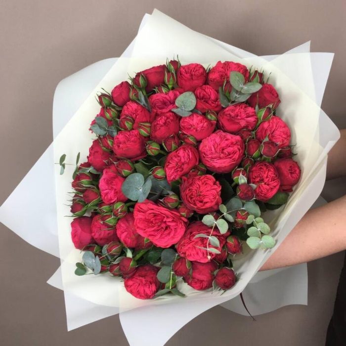 Лента – 1 шт.Эвкалипт – 4 шт.Пионовидная роза – 35 шт.Оформление – 1 шт.