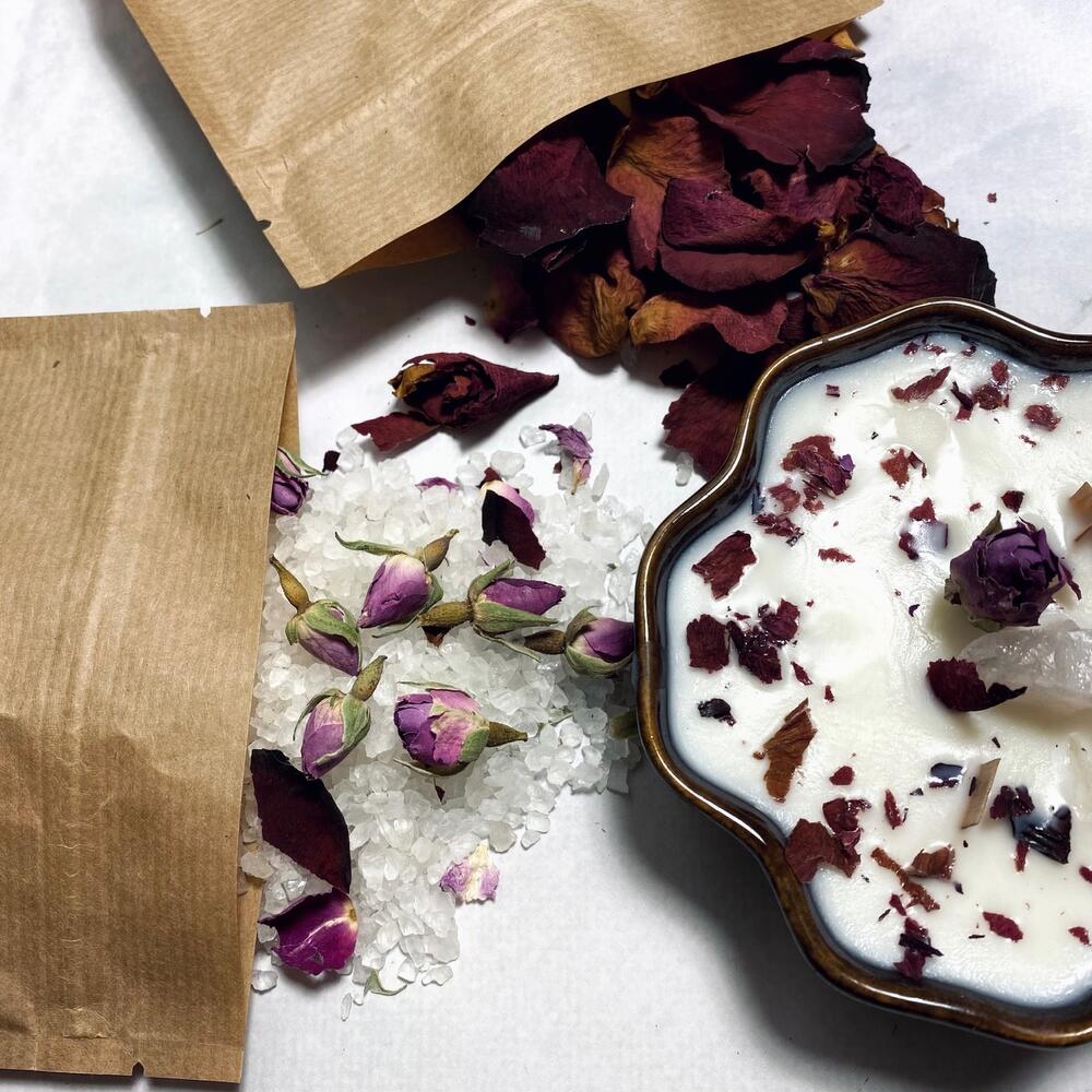Лепестки роз – 20 гр.репродукция – 1 шт.бутоны китайской розы – 20 гр.розовый кварц – 1 шт.аромасвеча в керамике – 1 шт.природная морская соль – 350 гр.