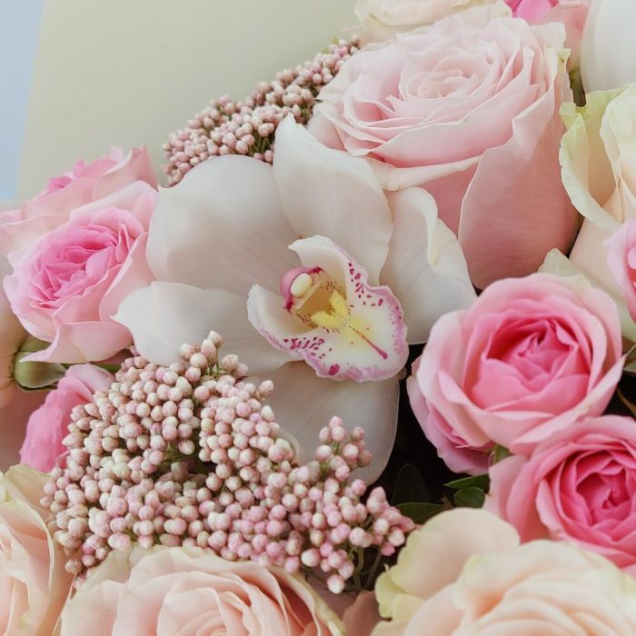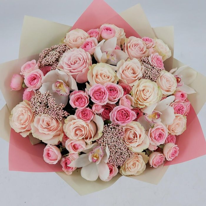 Роскошный и невероятно нежный букет из роз и орхидей. Такой букет всегда уместен и подойдёт для любого повода: День Рождения, именины, годовщина свадьбы, рождение ребенка, 8 марта, День Святого Валентина, выпускной и т.д. Можно вручить маме, сестре, подруге, коллеге, учителю, любимой.
