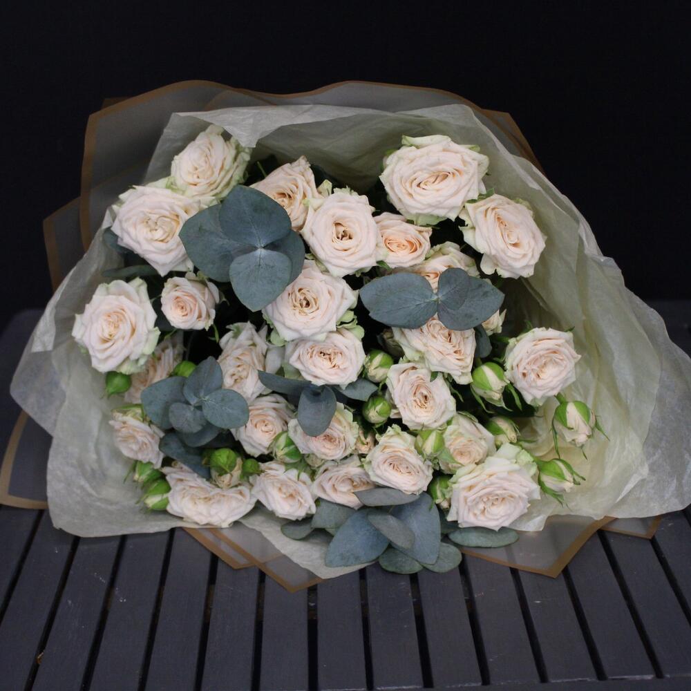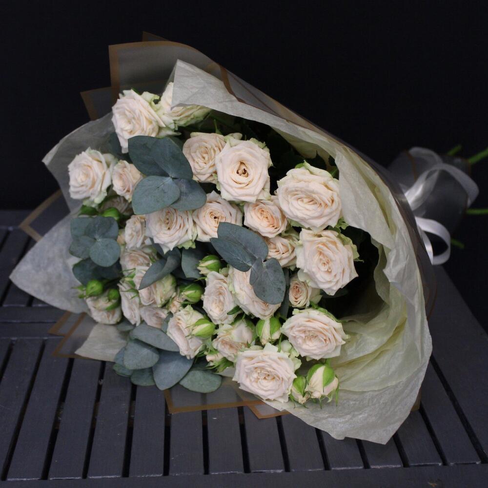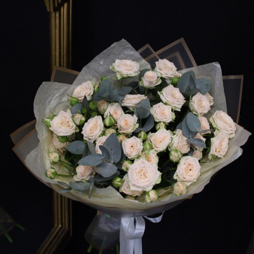 Эвкалипт – 3 шт.Лента атласная – 2 шт.Тишью – 3 шт.Пленка матовая – 3 шт.роза кустовая таня – 7 шт.