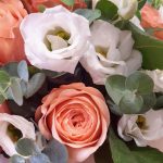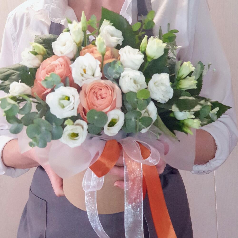 Роза Капучино – 3 шт.Эвкалипт – 3 шт.Лента атласная – 2 шт.Лизиантус белый – 5 шт.Открыточка с вашими пожеланиями – 1 шт.Оазис флористический – 1 шт.коробка шляпная крафт – 1 шт.